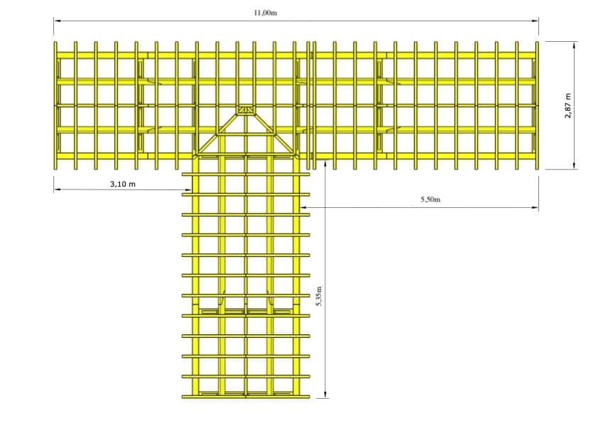 Het dennen bijgebouw Antwerpen bijgebouw is een luxueuze buitenconstructie die charme, lichtheid en functionaliteit verenigt. Met zijn T-vormige opstelling van 7,75 bij 11,00 meter en een royale nokhoogte van 3,52 meter biedt dit model een elegante oplossing voor wie een stijlvolle, maar toegankelijke houten structuur zoekt.