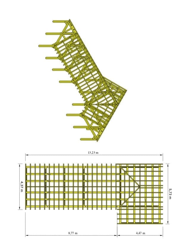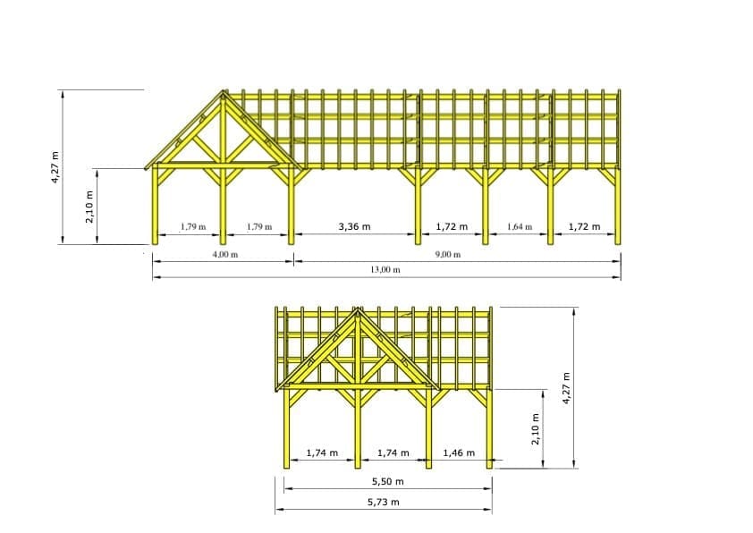 Het ontwerp van de Ninove is gebaseerd op traditionele massieve houtbouw, waarbij robuuste eiken balken de basis vormen. Deze constructiemethode staat garant voor een authentieke uitstraling én een lange levensduur. De indrukwekkende nokhoogte, de brede overspanningen en de open structuur creëren een gevoel van ruimte, terwijl de L-vorm extra mogelijkheden biedt voor een functionele indeling.